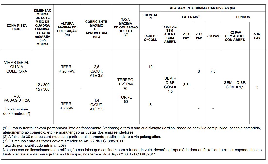 A criação da Zona Mista Dois, localizada atualmente parte na Macrozona Urbana de Consolidação – Residencial 1 e parte na Macrozona Urbana de Qualificação, tem como objetivo o aumento controlado da densidade populacional da área, propondo o controle da paisagem urbana e adotando o escalonamento da altura das edificações em direção ao fundo de vale e mesclando usos residenciais multifamiliares e atividades de comércio e serviços de baixo impacto ambiental e de vizinhança.
